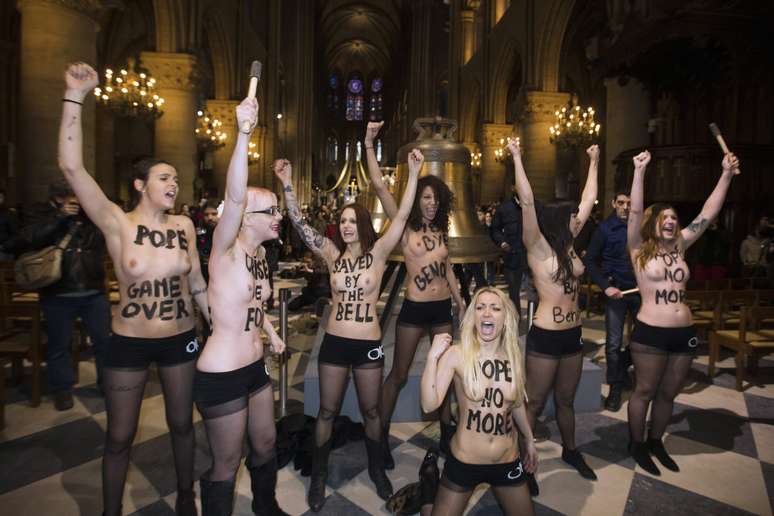 Feministas tiram roupa em Paris para festejar renúncia do Papa