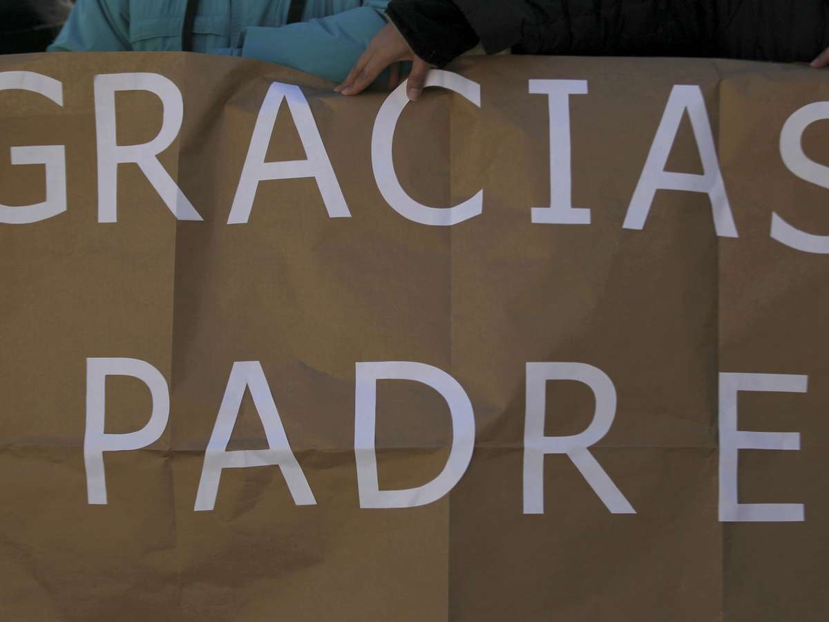 Uma grande faixa com letras vermelhas chama atenção durante a última audiência geral do papa Bento XVI