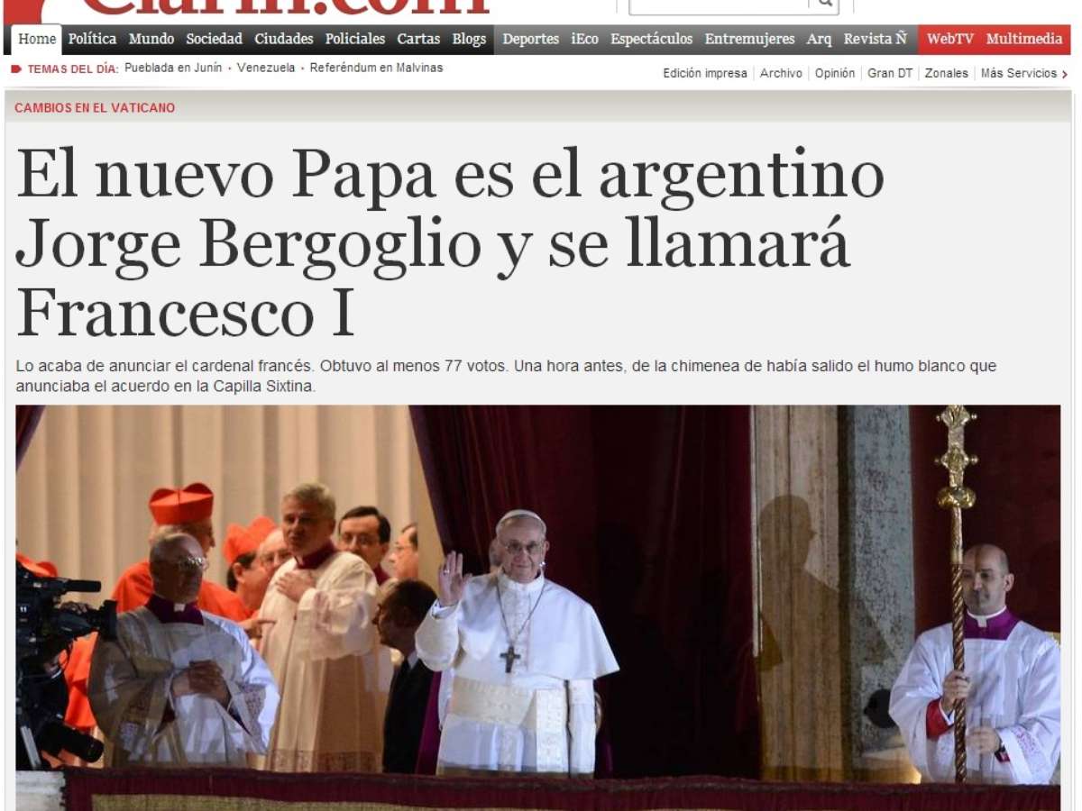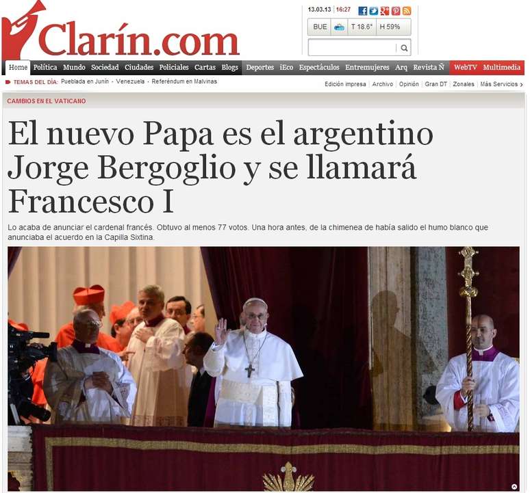 PUBLICIDADE Capa Notícias Mundo Europa Renúncia do Papa Papa Francisco Jornais argentinos destacam 'surpresa mundial' na eleição do novo Papa Compartilhar Capa da edição online do jornal Clarín Foto: Reprodução O diário esportivo Olé brinca com a escolha do Papa argentino: "As mãos de Deus: Maradona, Messi... e agora Jorge Mario Bergoglio Foto: Reprodução Capa da edição online do jornal Clarín Foto: Reprodução Edição online do La Nación destaca, em vermelho, escolha do arcebispo de Buenos Aires Foto: Reprodução Diário popular destaca 'surpresa mundial' na escolha de Bergoglio Foto: Reprodução Diário de Cuyo também destaca eleição do Papa argentino Foto: Reprodução Capa do jornal uruguaio El País Foto: Reprodução Compartilhar Publicidade Compartilhar TAGS Papa Francisco Notícias Mundo As Principais Notícias da Europa Publicidade