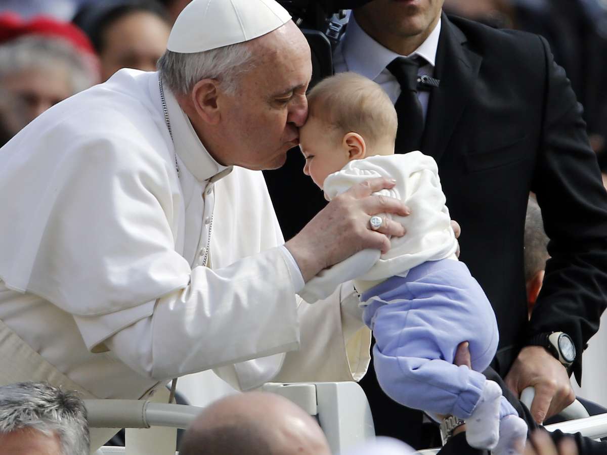 Francisco beija bebê durante o percurso em carro aberto pela Praça São Pedro