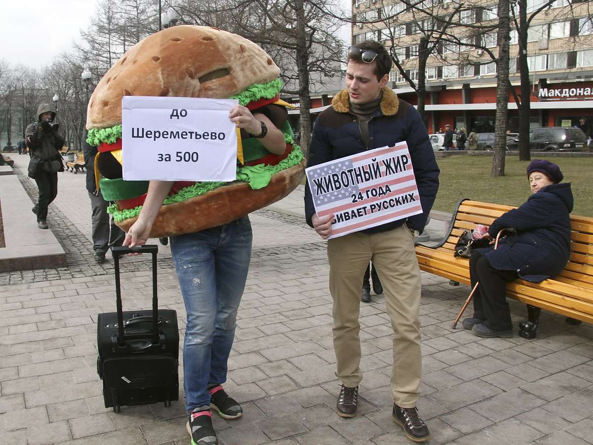Diante da curiosidade das pessoas presentes, um ativista vestido de hambúrguer marchou pela Praça Pushkinskaya de Moscou levando uma mala cheia de lanches do McDonalds que supostamente seriam encaminhados a sua "terra natal".