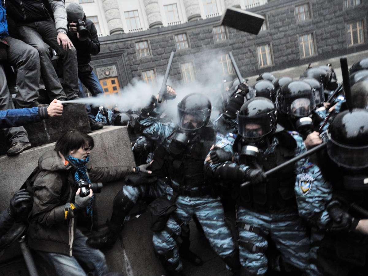 Manifestantes usam gás lacrimogêneo contra policiais, em Kiev