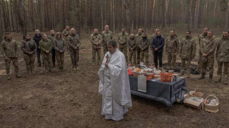 "A guerra continua e você não consegue relaxar porque, não importa qual seja o inimigo, ele sempre vai aproveitar o menor descuido", diz o soldado ucraniano Igor Kryvytch, que participou da celebração religiosa. "Os homens na linha de frente não têm folga", acrescenta.