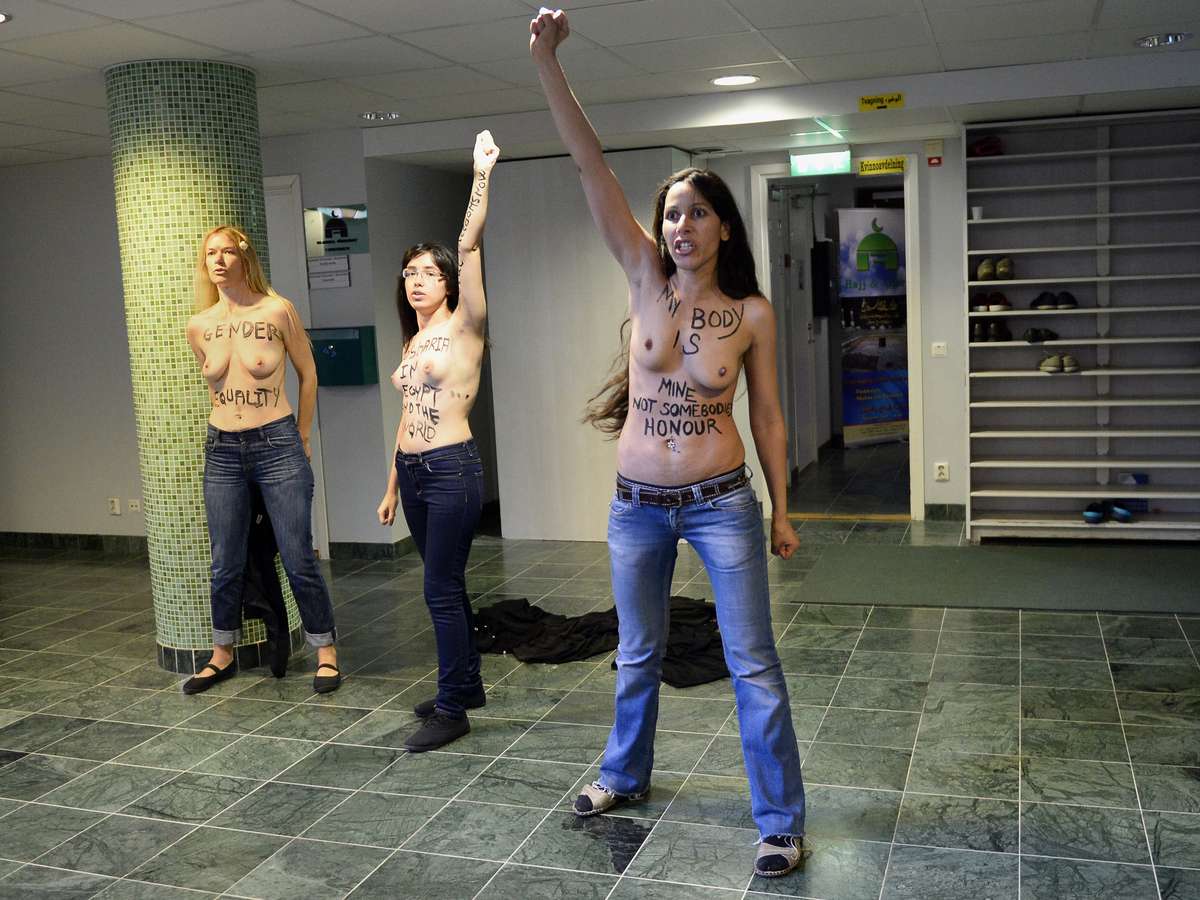 A polícia não confirmou a identidade ou a nacionalidade das manifestantes, que seriam uma egípcia, uma tunisiana e uma sueca. As ativistas feministas gritaram "Libertem as mulheres", "Não à sharia" e "Não à opressão".