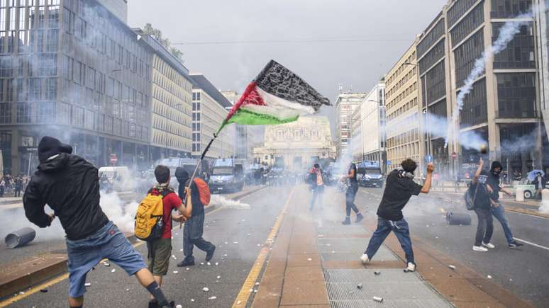 Diversas cidades italianas foram palco de manifestações, greves e bloqueios nesta segunda-feira (22), em protesto contra a ofensiva de Israel na Faixa de Gaza. A mobilização foi marcada por confrontos violentos entre os participantes e a polícia em Milão.