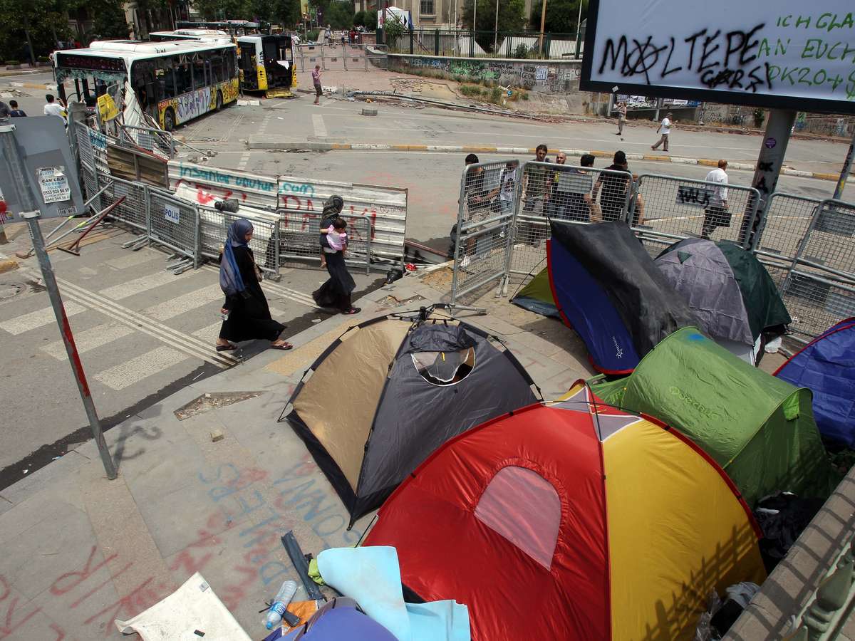 Na Praça Taksim, no centro de Istambul, onde policiais apoiados por helicópteros e veículos blindados primeiro entraram em confronto com os manifestantes há uma semana, os ativistas passaram a noite em um acampamento improvisado, dormindo em tendas, ônibus destruídos ou embrulhados em cobertores sob as árvores.