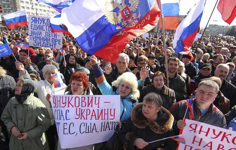 "Rússia, nos ajude!", "Yanukovytch, nos ajude!", gritavam os manifestantes, que exigiam também a renúncia de Serguei Taruta, bilionário nomeado recentemente governador da região pelas novas autoridades em Kiev.