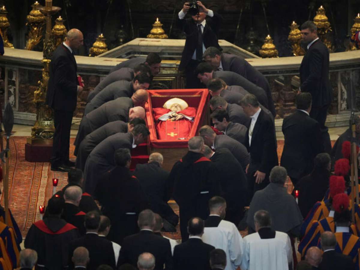 Os cantos do coral da Capela Sistina ecoaram durante toda a procissão. O caixão foi carregado por membros da equipe cerimonial do Vaticano em ternos escuros e ladeado por oito guardas suíços.