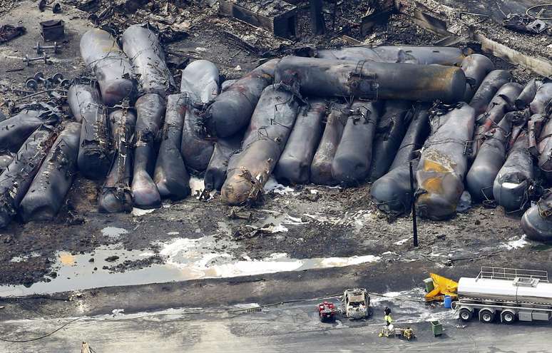 8 de julho - Bombeiros trabalham junto aos destroços de trem que explodiu após descarrilar na localidade de Lac Megantic. Passados dois dias, o acidente com o trem de carga, que deixou 5 mortes confirmadas e outras 40 pessoas desaparecidas, intriga a polícia canadense, que ainda busca entender o que levou a locomotiva a perder os freios quando estava estacionada