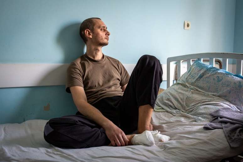 Nikita Horban está sentado de pernas cruzadas em uma cama de hospital antiquada de aço, passando os dedos sobre a parte plana do curativo onde antes ficavam seus dedos dos pés.