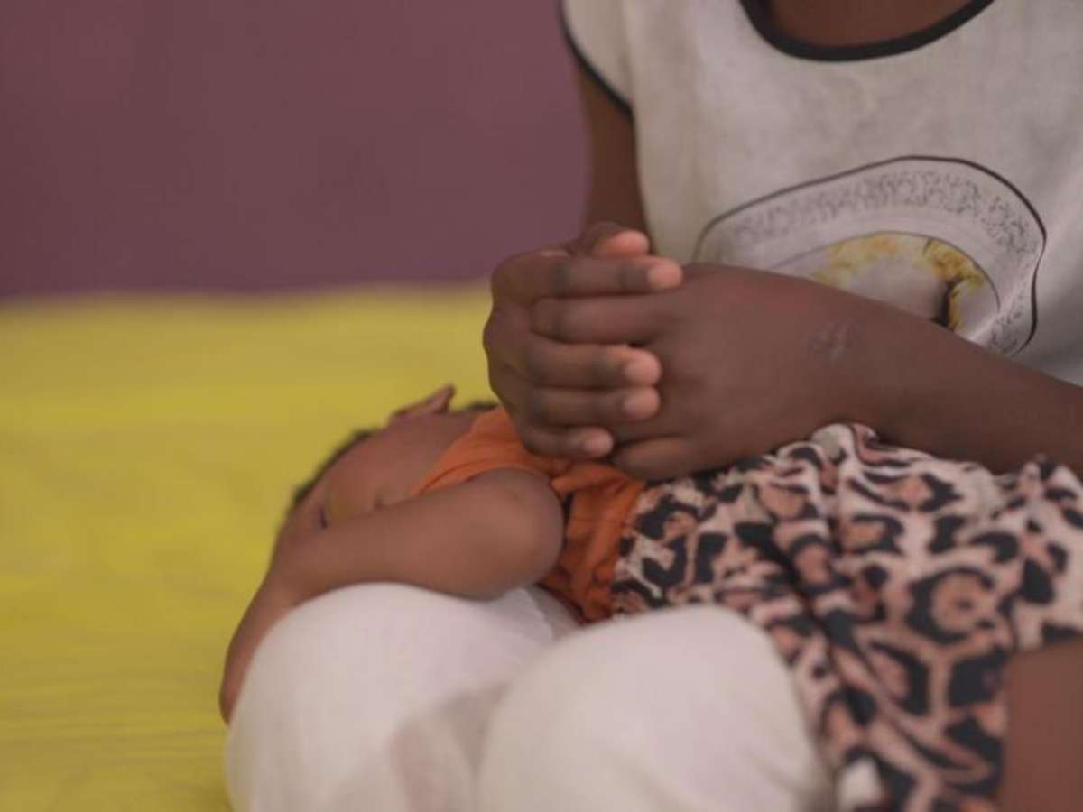 Ela faz carinho na filha, que dorme no seu colo, e descreve como homens armados a sequestraram enquanto ela tentava fugir. Eles a mantiveram em cativeiro por mais de dois meses.
