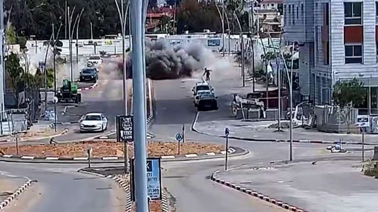 Câmeras de segurança da Prefeitura de Or Yehuda mostram o homem caminhando ao lado de uma estrada quando ocorre uma grande explosão