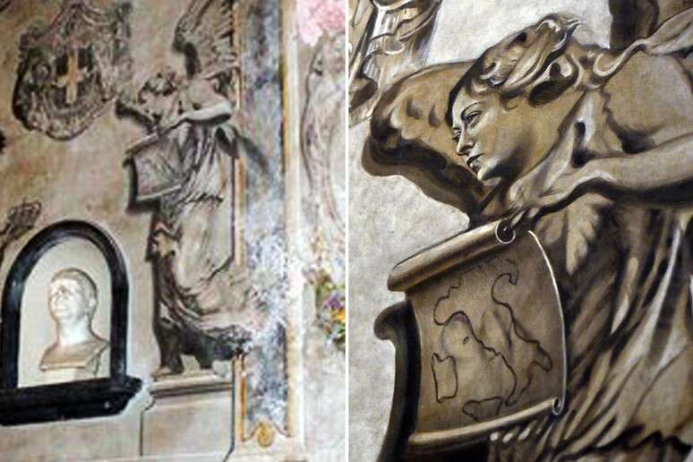 O afresco fica na Basílica de San Lorenzo in Lucina, a 400 metros da sede do governo italiano, e retrata uma figura alada segurando um pergaminho com o mapa da península, ao lado de um busto do último rei do país, Umberto II.