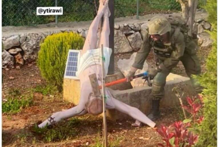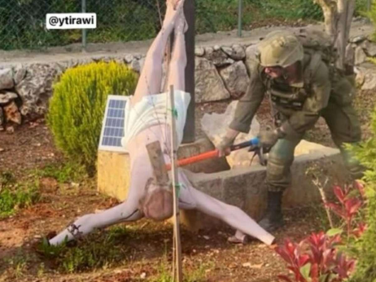 O episódio ocorreu no vilarejo cristão de Debel, no último fim de semana, quando viralizou uma imagem que mostra um militar israelense atingindo a cabeça da estátua, que havia caído da cruz, com uma marreta.