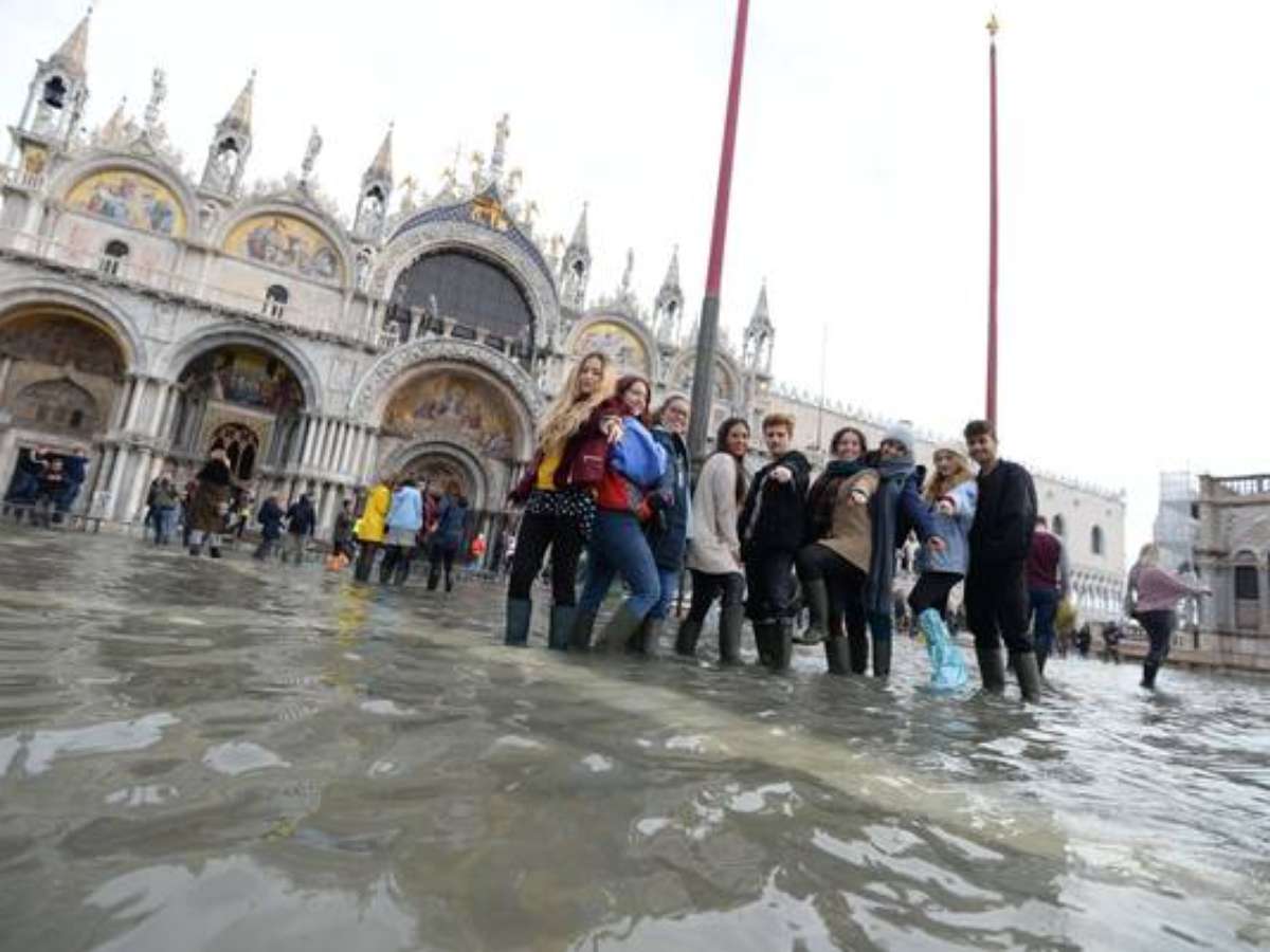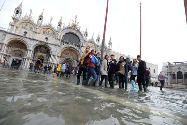 No último sábado (16), entre uma "acqua alta" e outra, turistas invadiram uma Praça San Marco ainda inundada e não perderam a oportunidade de tirar fotos com suas galochas no ponto mais visitado da cidade e de fazer fila nas passarelas montadas pelas autoridades municipais.