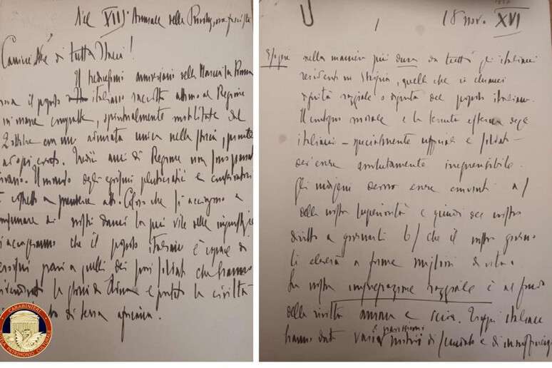 Os documentos foram localizados quando estavam prestes a ser leiloados por uma renomada casa de Turim, e as primeiras investigações confirmaram que as folhas continham anotações com a caligrafia de Mussolini, assim como a marca "M" no rodapé da última página, um monograma utilizado pelo próprio ditador.