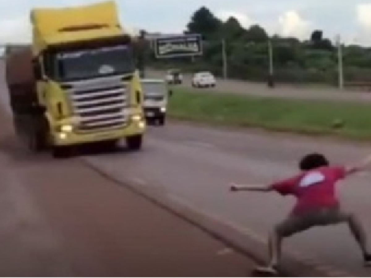 O episódio ocorreu em uma rodovia de pista dupla, onde o jovem sai do acostamento e entra na via no momento em que um caminhão se aproxima em alta velocidade. Nas imagens, ele participa de um “jogo da galinha”, em que balança os braços enquanto o veículo avança em sua direção. Sem alternativas seguras para desviar, o motorista prosseguiu, contando com a sorte para evitar o pior. O jovem só saiu da frente do veículo no instante final.