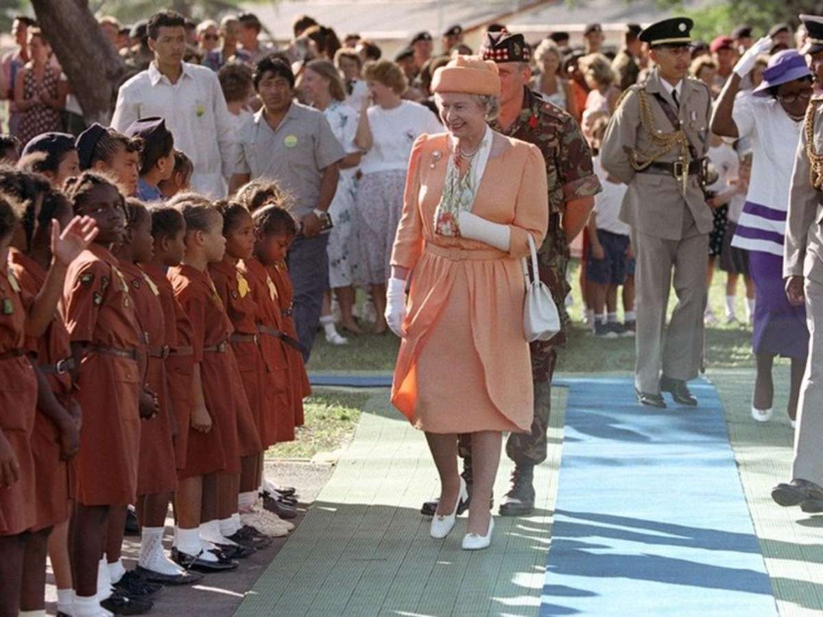 O Memorial Park, na cidade de Belize ,estava cheio de convidados. Outros subiram em árvores e telhados para tentar enxergar a rainha passar.