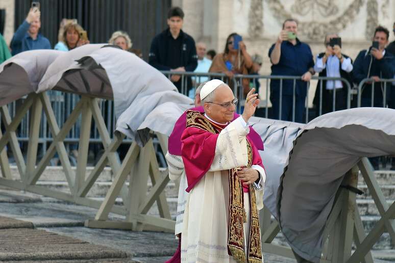 "Hoje posso dizer que, com vocês e por vocês, eu sou romano", declarou o primeiro pontífice norte-americano em sua saudação aos presentes na breve cerimônia, citando Santo Agostinho.