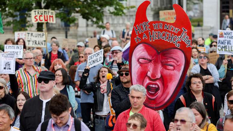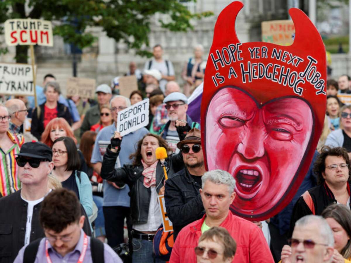 Manifestantes protestam contra visita de Trump à Escócia, marcada por golfe e negociações comerciais