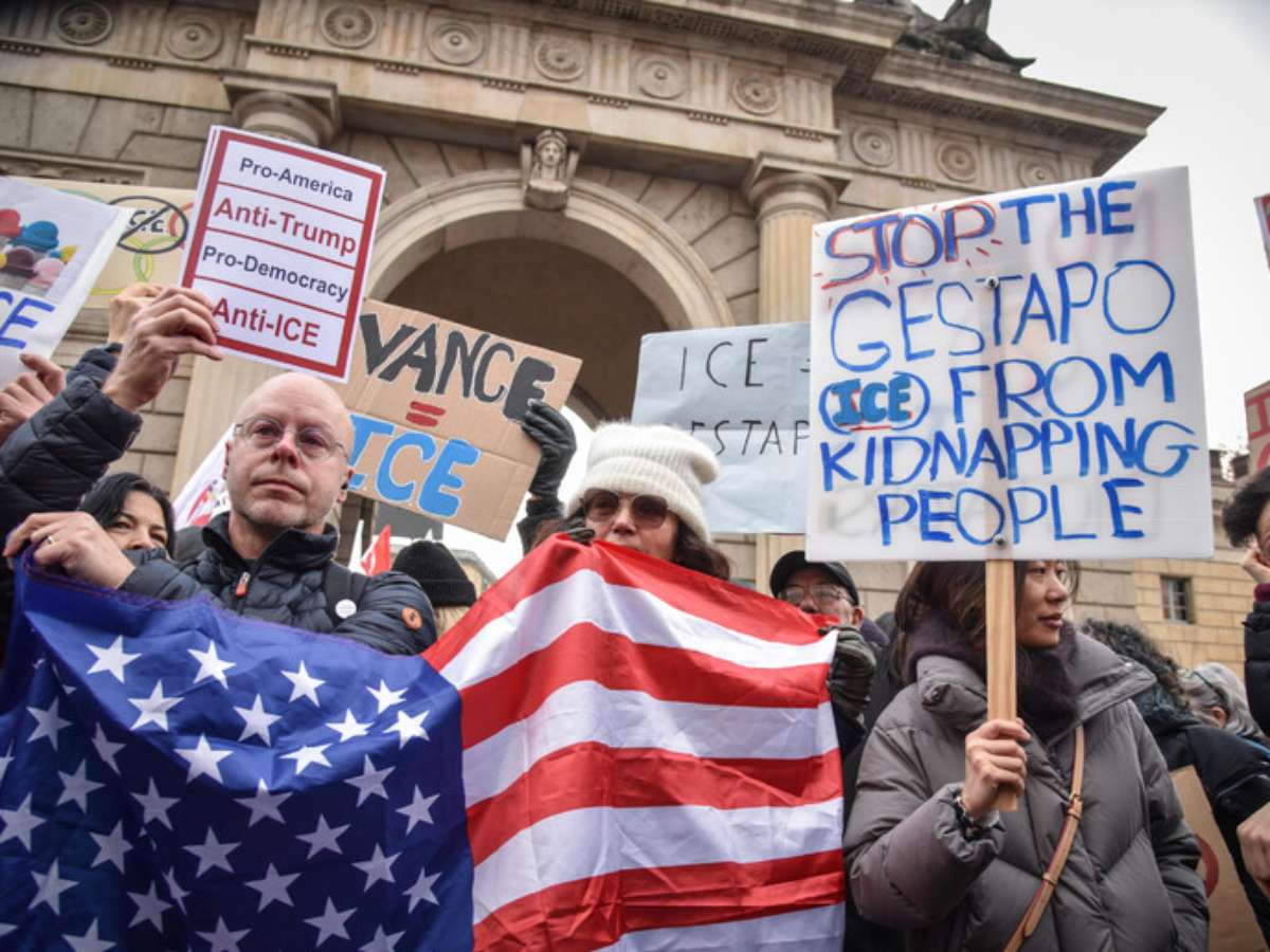 Além disso, cidadãos americanos exibiram fotos da poeta Renée Good e do enfermeiro Alex Pretti, ambos assassinados a tiros pelo ICE enquanto tentavam obstruir operações em Minneapolis.