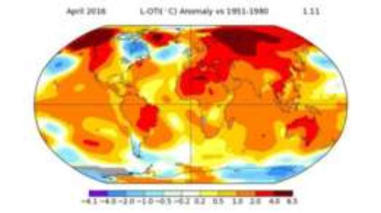 O mês de abril foi o sétimo seguido a bater recordes de temperatura global, segundo um mapa da Nasa, a agência espacial americana.