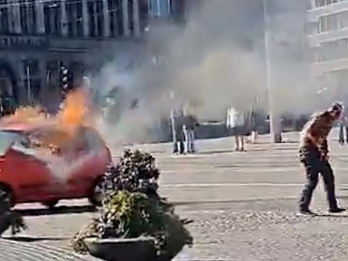 Um carro explodiu na Praça Dam, em Amsterdã, deixando o motorista ferido; polícia suspeita de incêndio criminoso e tentativa de suicídio.