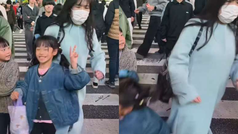 Nas imagens, a criança aparece posando para o vídeo da mãe em um cruzamento da cidade de Shibuya, quando uma mulher passa e dá uma cotovelada na menina. Com a força, a criança se desequilibra e cai no chão.