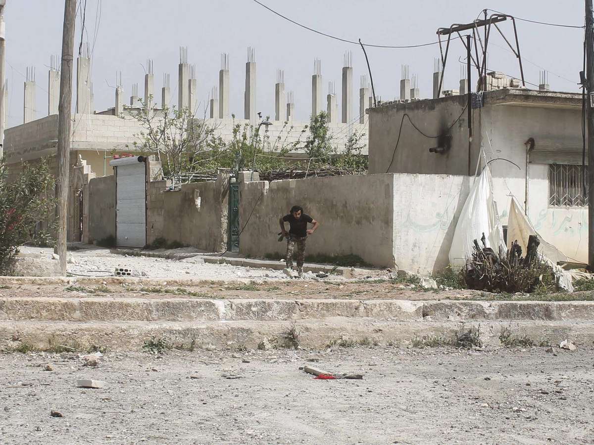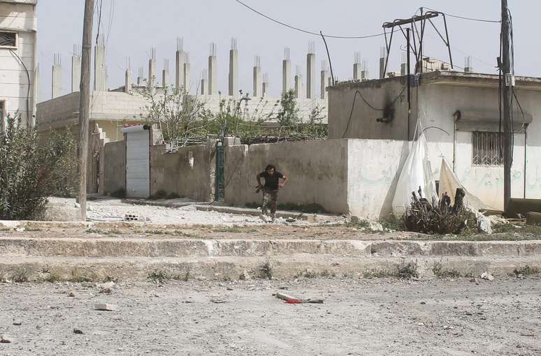 Um combatente rebelde corre para fugir de atiradores leais ao presidente da Síria, Bashar al-Assad, na vila Morek, em Hama, em 30 de março