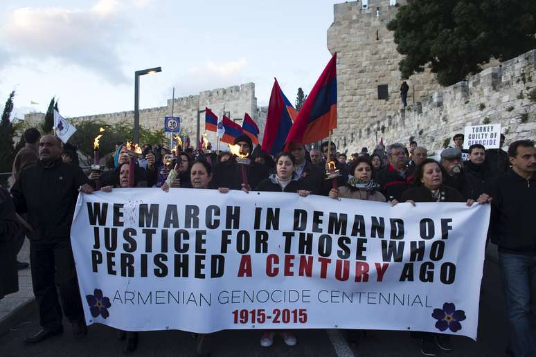 A imagem é uma das muitas espalhadas pela cidade para lembrar o centenário do massacre de até 1,5 milhão de armênios nas mãos dos turcos-otomanos, cujo império estava desintegrando em meio à 1ª Guerra Mundial. Muitas das vítimas eram civis deportados a regiões desérticas, onde morreram de fome e sede. Outros milhares foram massacrados.