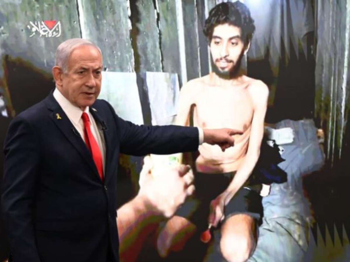O premiê israelense aproveitou para mostrar uma foto do refém Evyatar David, visivelmente debilitado, e afirmar que "os únicos que estão morrendo de fome deliberadamente são nossos reféns".