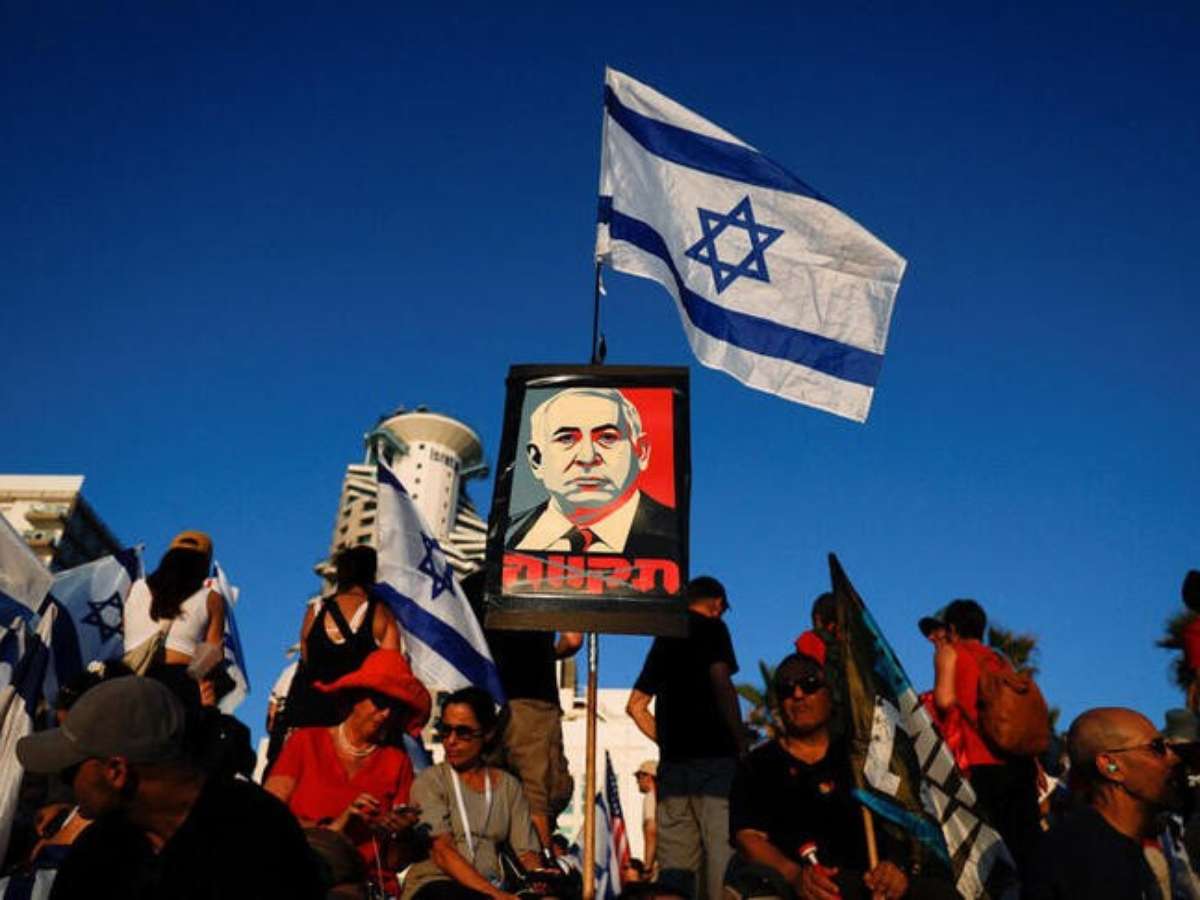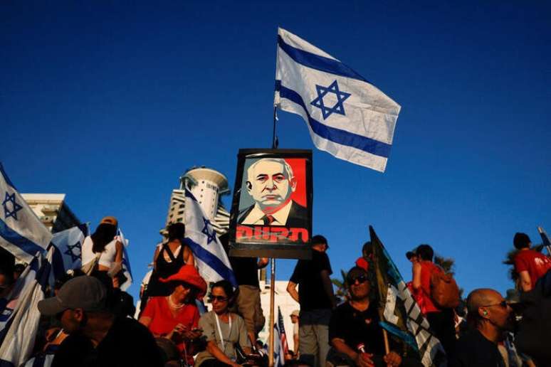 À medida que o debate no parlamento prosseguia, dezenas de milhares de israelenses que se opunham às mudanças judiciais se alinhavam nas ruas da cidade de Jerusalém carregando bandeiras e tocando tambores sob um sol escaldante de verão. Muitas tendas armadas em um parque perto do Knesset.