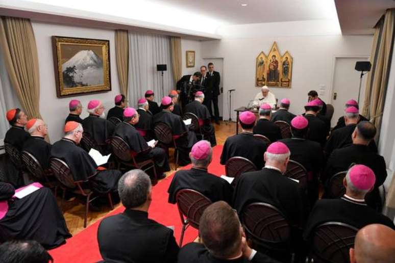 "Estou muito feliz pela oportunidade de visitar o Japão. Não sei se vocês sabem, mas desde jovem sinto simpatia e carinho por essas terras. Hoje, o Senhor me oferece a oportunidade de estar entre vocês como um peregrino missionário", disse Francisco na Nunciatura Apostólica com os bispos do Japão.
