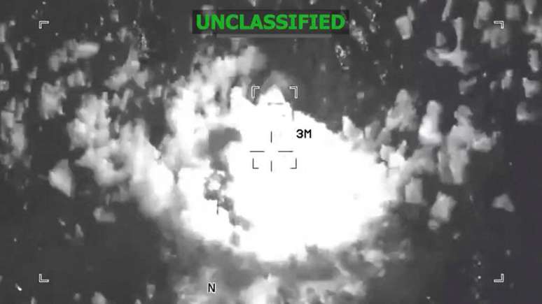 Um ataque militar dos EUA ao que eles afirmaram ser um navio suspeito de transportar drogas em águas internacionais, em um local indicado como o Pacífico Oriental na captura de tela do vídeo divulgado em 4 de dezembro de 2025.