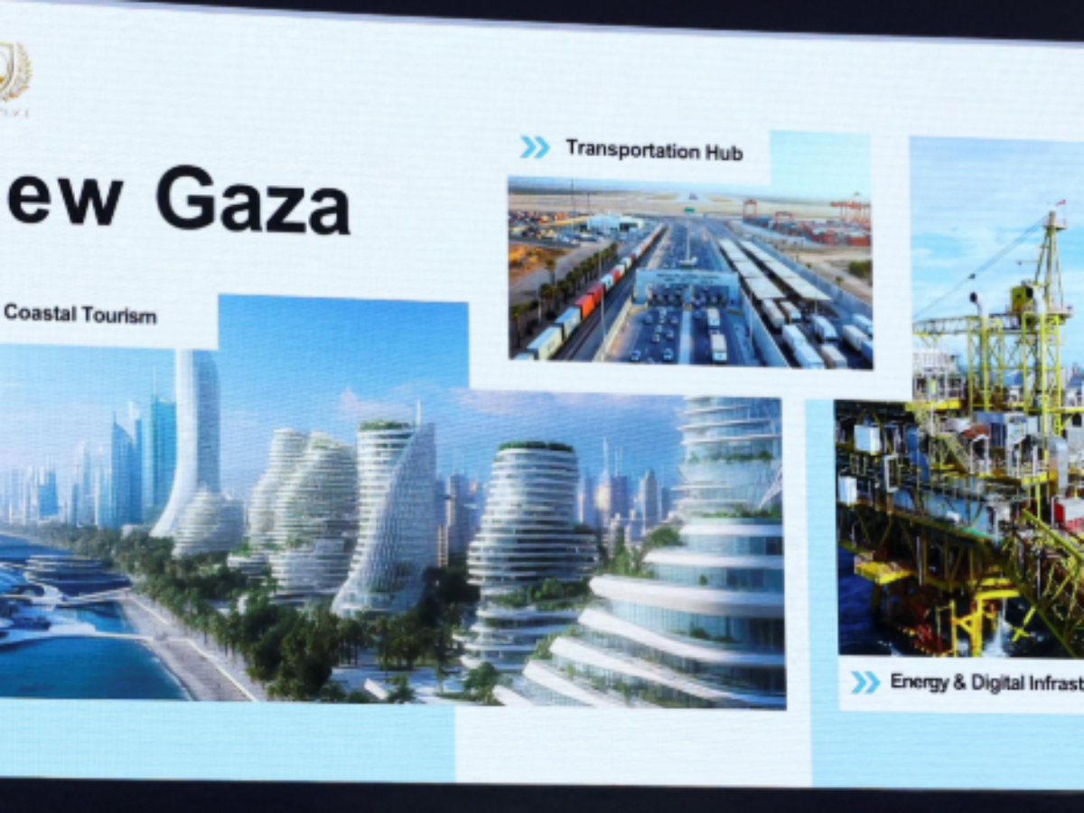 Uma série de slides mostra dezenas de arranha-céus ao longo da costa do Mediterrâneo e bairros residenciais na zona de Rafah, no sul da Faixa de Gaza. E um mapa indica o empreendimento por fases, com novas zonas residenciais, agrícolas e industriais para os 2,1 milhões de habitantes do território.