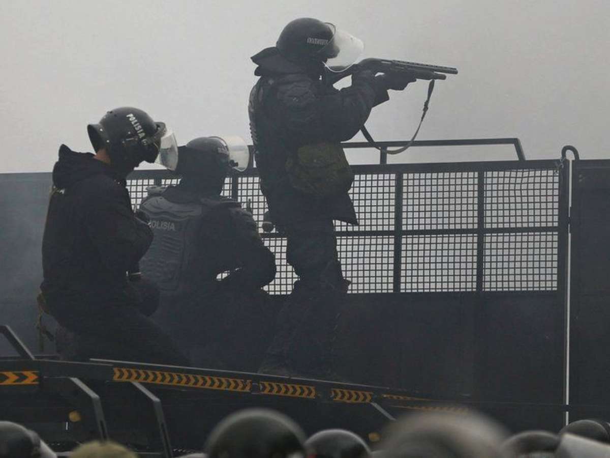 Esses confrontos rapidamente se tornaram violentos: a polícia usou gás lacrimogêneo e bombas de efeito moral contra uma multidão de milhares de pessoas em Almaty.