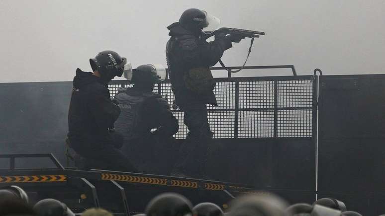 Os manifestantes também invadiram o gabinete do prefeito em Almaty, onde vídeos nas redes sociais mostraram uma nuvem de fumaça subindo do prédio, enquanto tiros podiam ser ouvidos.