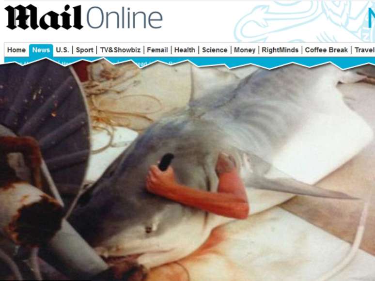 No entanto, a imagem não retrata com precisão o que aconteceu. Trata-se de uma pegadinha. Segundo o Daily Mail, o pescador, que não foi identificado, de fato capturou o tubarão. Mas, somente após ter certeza que o animal estava morto, cortou a carcaça e simulou ter sido engolido por ele. O pescador então fez seu braço atravessar as guelras do tubarão e posou para foto como se estivesse o esfaqueando.