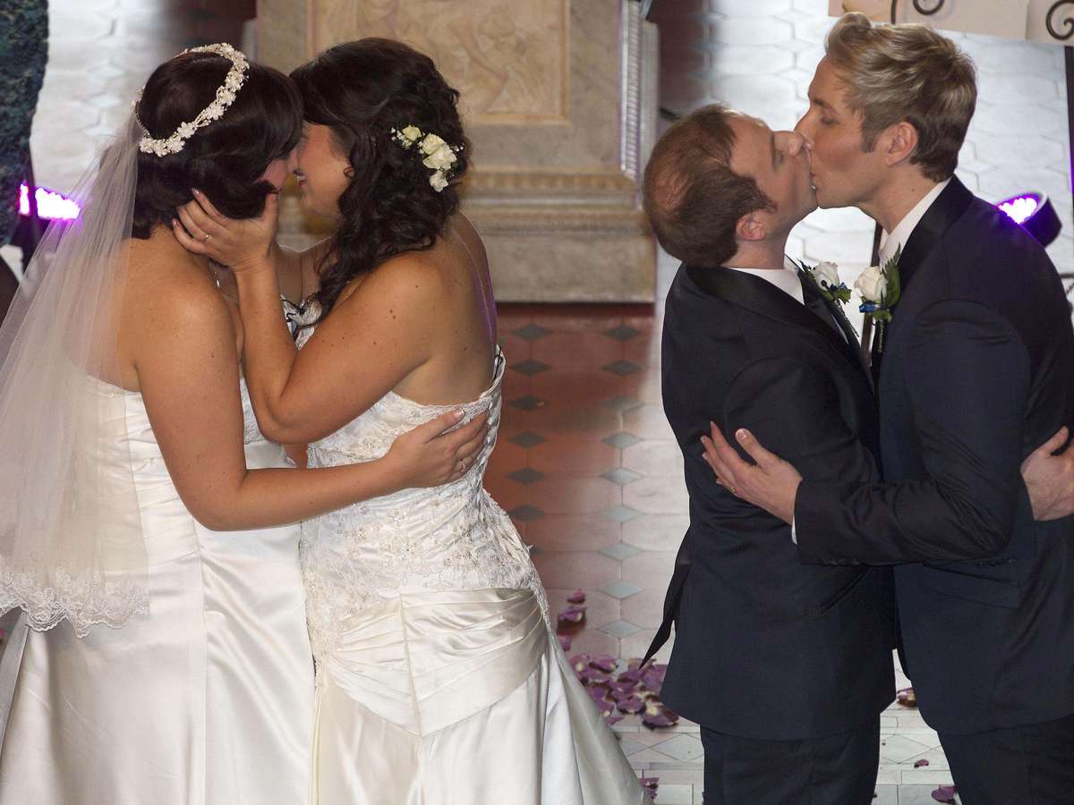 Rachel Briscoe (esq.) e Jess Ivess celebram seu casamento ao mesmo tempo que Richard Andrew e Richard Rawstorn (dir.) comemoram o seu, em cerimônia na localidade de Rotorua