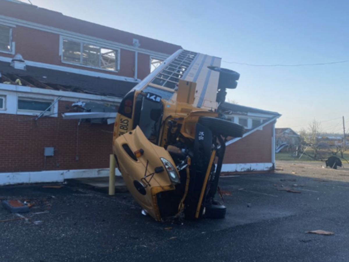 Ônibus fica pendurado em telhado de escola nos EUA após tornado; veja vídeo