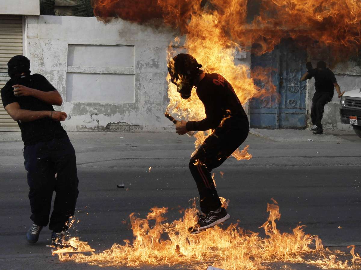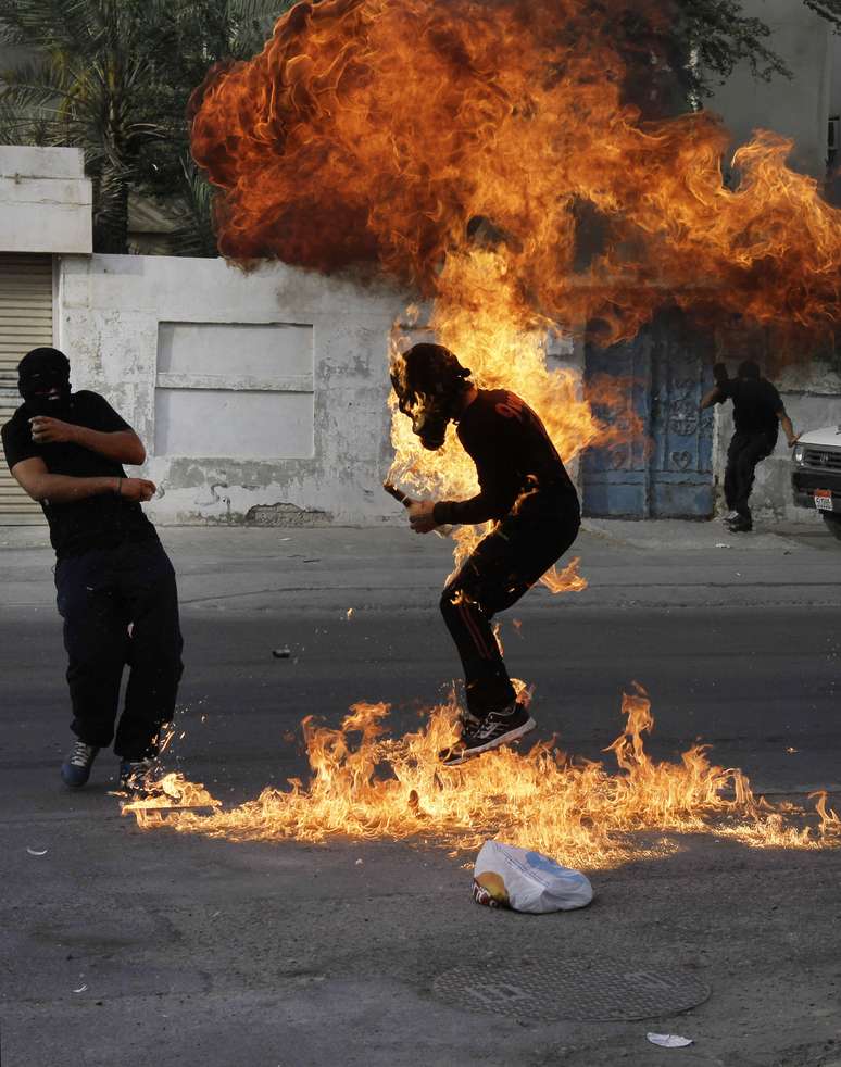 Manifestante é envolto em chamas depois que tiro disparado por policial atingiu uma bomba que ele carregava nas mãos e se preparava para jogar em direção às forças de segurança durante protesto contra o governo no Bahrein