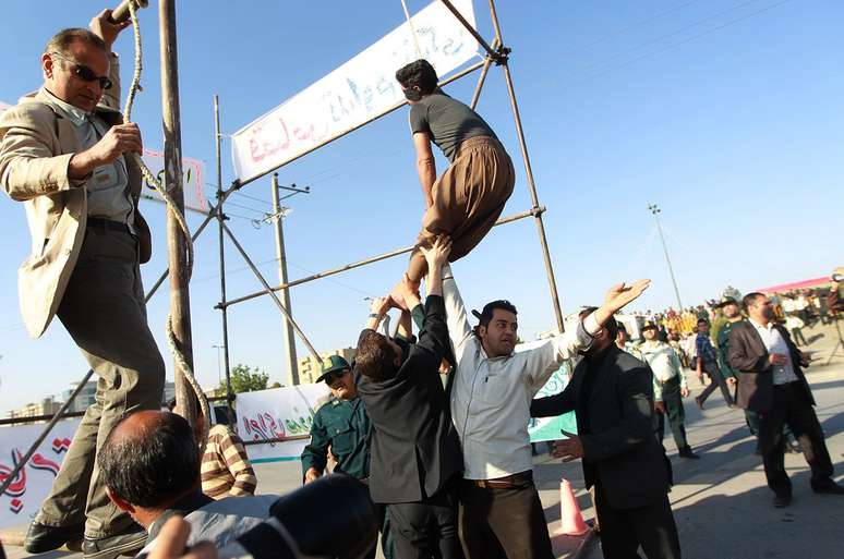 Uma imagem da agência iraniana Mehr distribuída pelas agências internacionais mostra algumas pessoas segurando pelas pernas o homem pendurado na forca, tentando salvá-lo da morte.