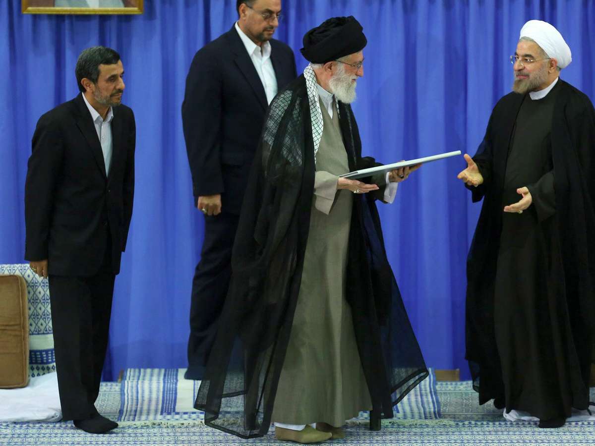 Simbolizando a transferência de poder, Khamenei tomou o mandato presidencial de Ahmadinejad e entregou o documento a Rouhani. Khamenei beijou então Rouhani no rosto e o novo presidente beijou o líder em seu ombro, um sinal de suplício.