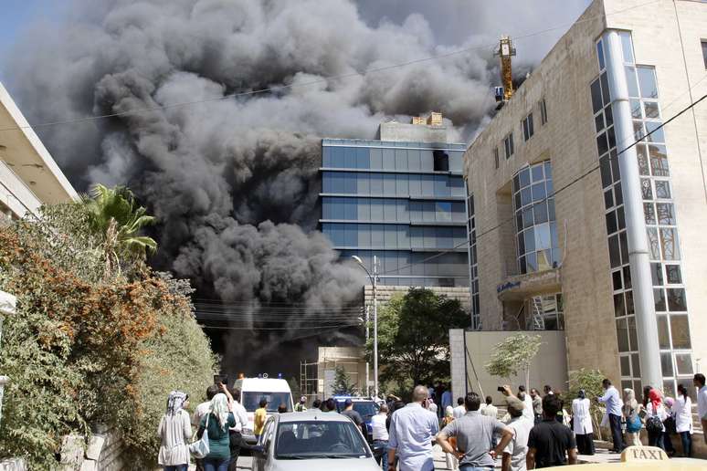 Pessoas observam enorme coluna de fumaça que sai de hospital privado em construção em Amã, capital da Jordânia. As autoridades locais dizem que um curto circuito provocou um grande incêndio no Hospital Farah, que fez a área ao redor ficar coberta pela fumaça, causando grandes congestionamentos. Não há informações sobre vítimas