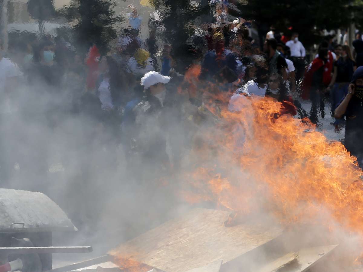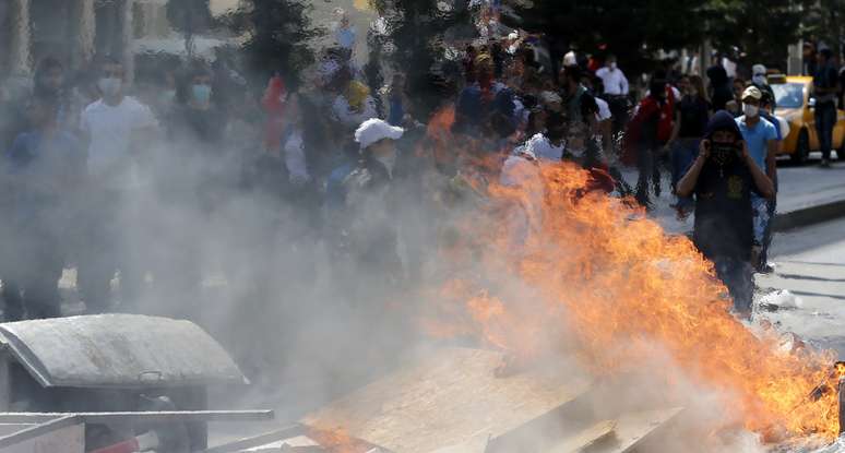 Barricada é incendiada durante os confrontos com a polícia em Ancara