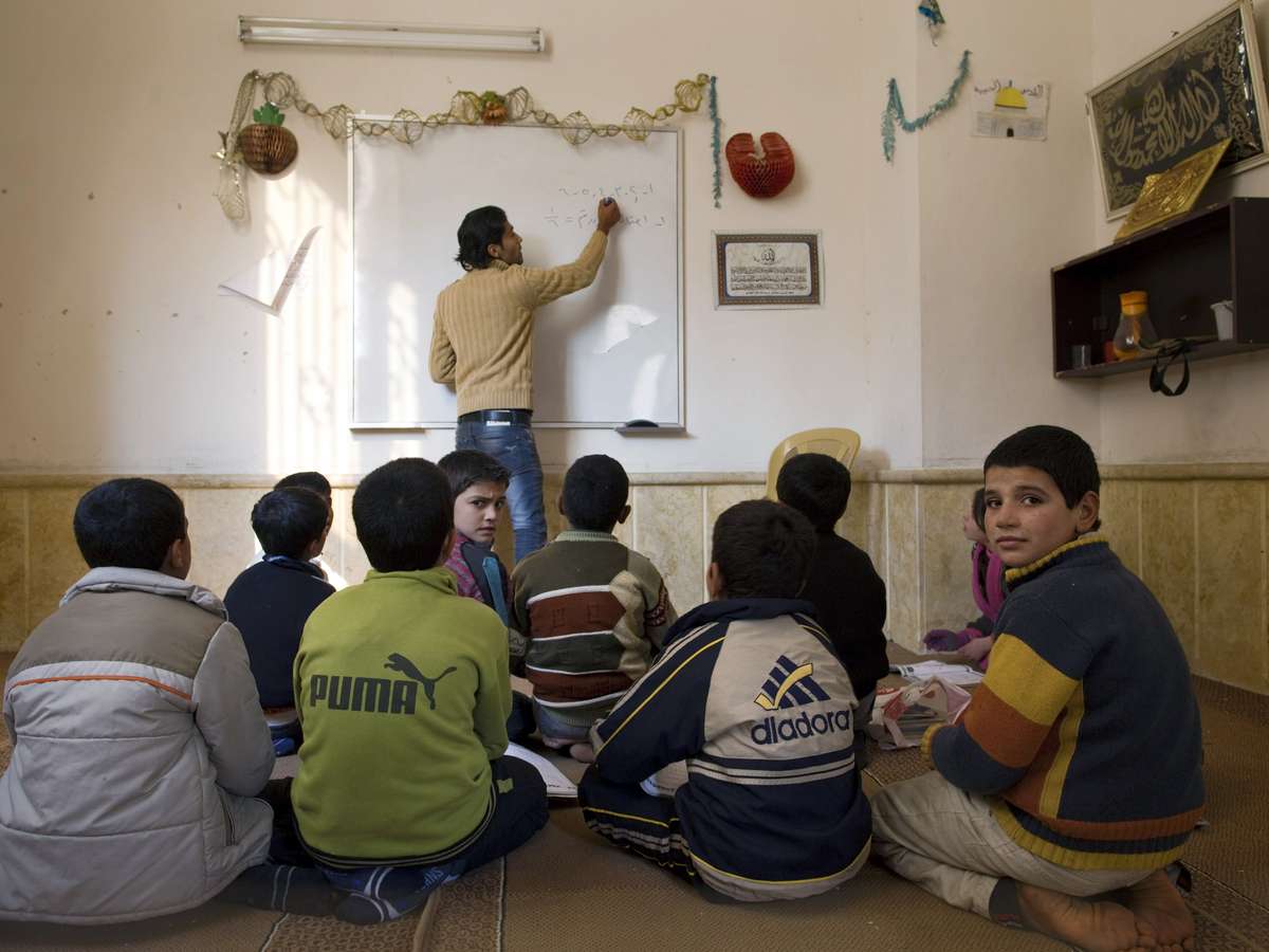 Nós dividimos cerca de 50 crianças em três salas de aula. Elas frequentam as aulas todos os dias. "Este lugar é como um hospital. Aqui as crianças vêm em busca de ajuda e nós tentamos solucionar seus problemas. Elas são o futuro da Síria", diz Mohamad Handu, 24 anos, formado em química.