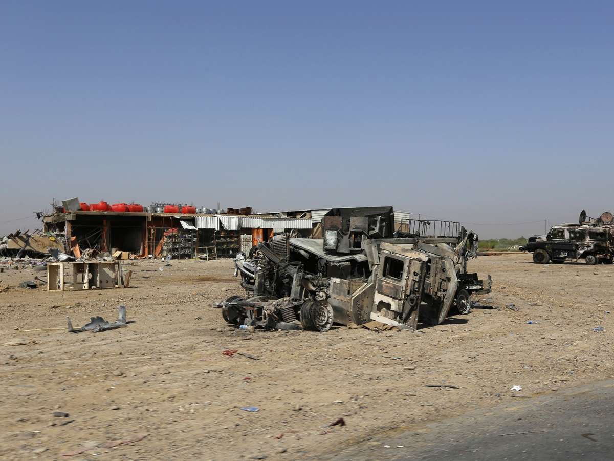 Veículos queimados pertencentes às forças de segurança iraquianas são vistos em uma estrada que leva a Samarra, na província de Salahuddin, em 12 de julho