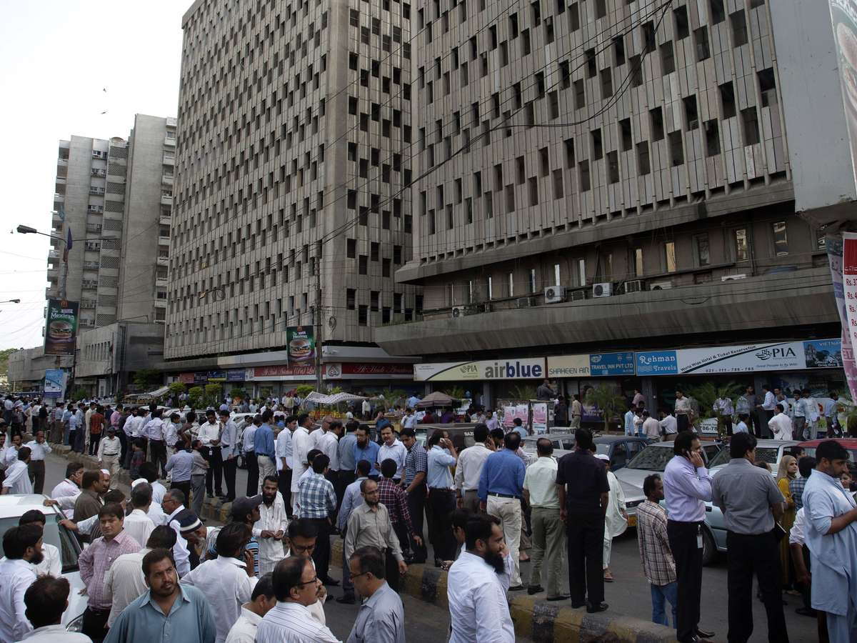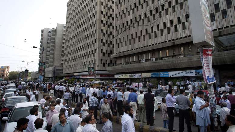 Pessoas se reúnem em rua de Karachi, no Paquistão, após prédios locais serem evacuados. Um terremoto de 7.8 graus de magnitude foi registrado nesta quinta-feira no Irã, próximo à fronteira com o Paquistão, e sentido em outros países próximos