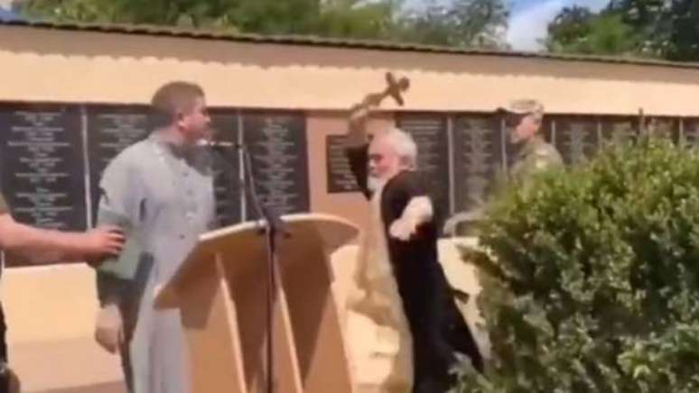 Um padre da Igreja Ortodoxa russa, identificado como Mykhailo Vasylyuk, subiu ao altar e tentou agredir o capelão ucraniano Anatoliy Dudko com a cruz que usava no pescoço durante o funeral de um soldado de Kiev.