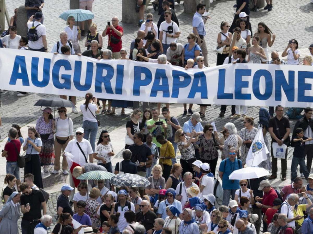 Os fiéis presentes na praça também exibiram balões e cartazes com alusão ao aniversário de Leão XIV, enquanto bandas tocaram músicas de parabéns para o Papa.